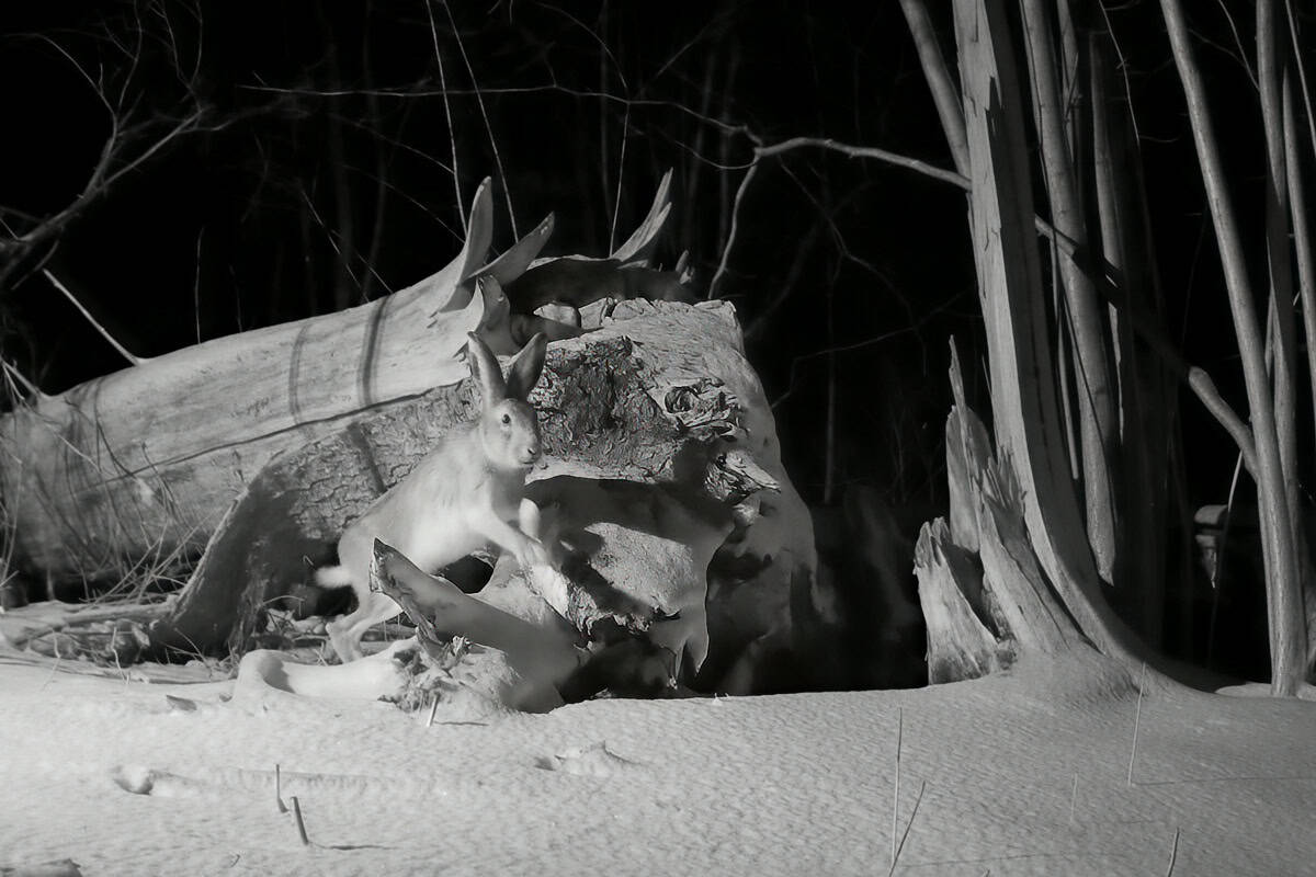 Fotodokument sellest, kuis talvisel ajal liiguvad halljänesed valgejäneste juurde metsa. Innukalt kärneritööd tehes hoiavad jänesed mõnes kohas ära metsaaluse võsastumise.